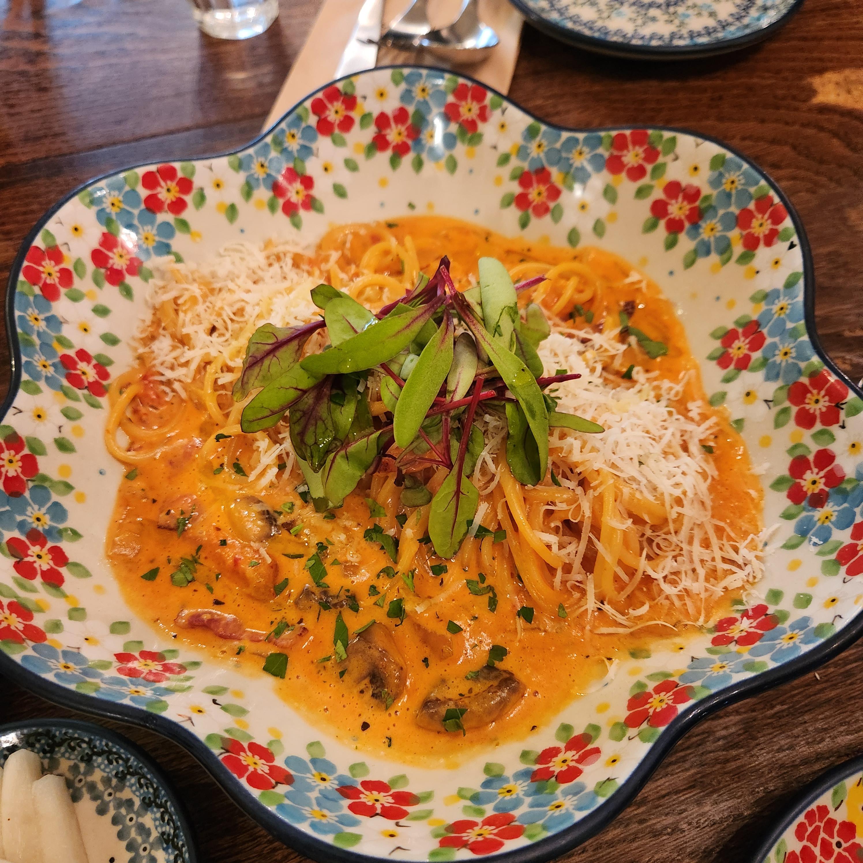 소스가 좀 있는 파스타는 이쁜 빨간 꽃이 그려져있는 볼접시에 나왔고