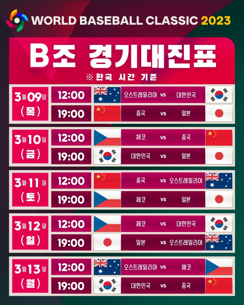 한국시간으로 어제 공개된 B조 WBC 일정입니다. 호주와 일본, 체코, 중국이 차례로 경기를 치르게 되는데 가장 중요한 경기는 일본과의 경기입니다. 그리고 호주와의 대회 첫 경기도 눈여겨볼 만합니다. 호주전은 8강 진출을 위해선 최소 2위를 확보해야 하기 때문에 반드시 이겨야 합니다.